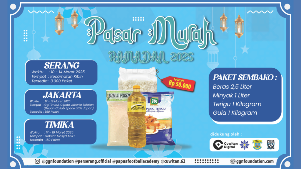 Dalam upaya mendukung akses masyarakat terhadap kebutuhan pokok dengan harga yang lebih terjangkau, Grha Gemah Nusa Foundation akan menyelenggarakan Pasar Murah di 3 kota berbeda. Program ini diselenggarakan bekerja sama dengan Klub Perserang (Banten), Cuwuitan Digital (Jakarta), dan Papua Football Academy (Timika), yang berperan sebagai mitra pelaksana di masing-masing wilayah.